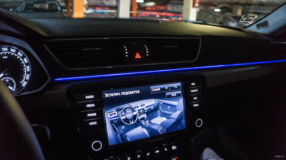 Уже вечером, подъехав к отелю, поизучали еще одну интересную возможность: включение подсветки некоторых элементов салона. Причем подсветка может быть различных цветов.