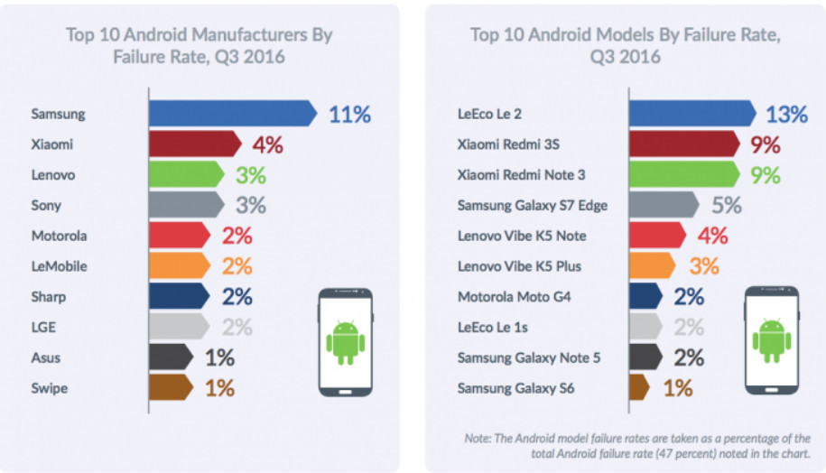 В сегменте Android наименее надёжной моделью признана LeEco Le 2, а среди производителей хуже всего дела обстоят у Samsung.