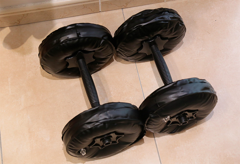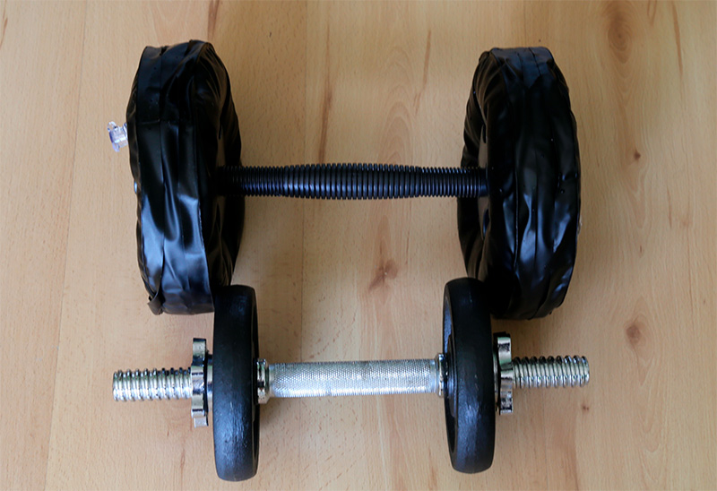 Полез опять шерстить "Амазон", но там все очень тухло: наборных нет, у большинства написано, что только появятся в продаже после 10 июня, ну или же есть, но за дикие деньги (реально порядка 250 евро) и тоже непонятно, когда доставят. При этом в продаже есть какие-то очень странные гантели, которые как будто надувные. Я думал, что это типа для розыгрышей, но нет, оказалось, что они не надувные, а водоналивные. И вроде обещают, что там можно сделать вес от 1 до 20 килограммов.