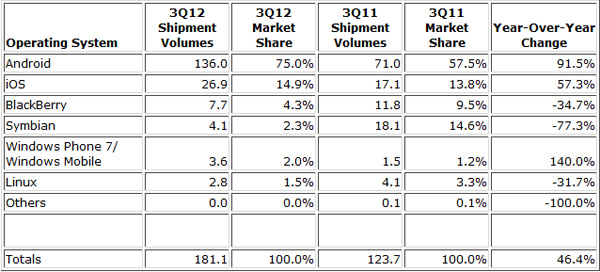 Так вот, просто чтобы не было иллюзий. Вот отчет известной аналитической фирмы IDC по продажам смартфонов с различными операционными системами по третьему кварталу 2012 года по всему миру. Интересная табличка, не правда ли?