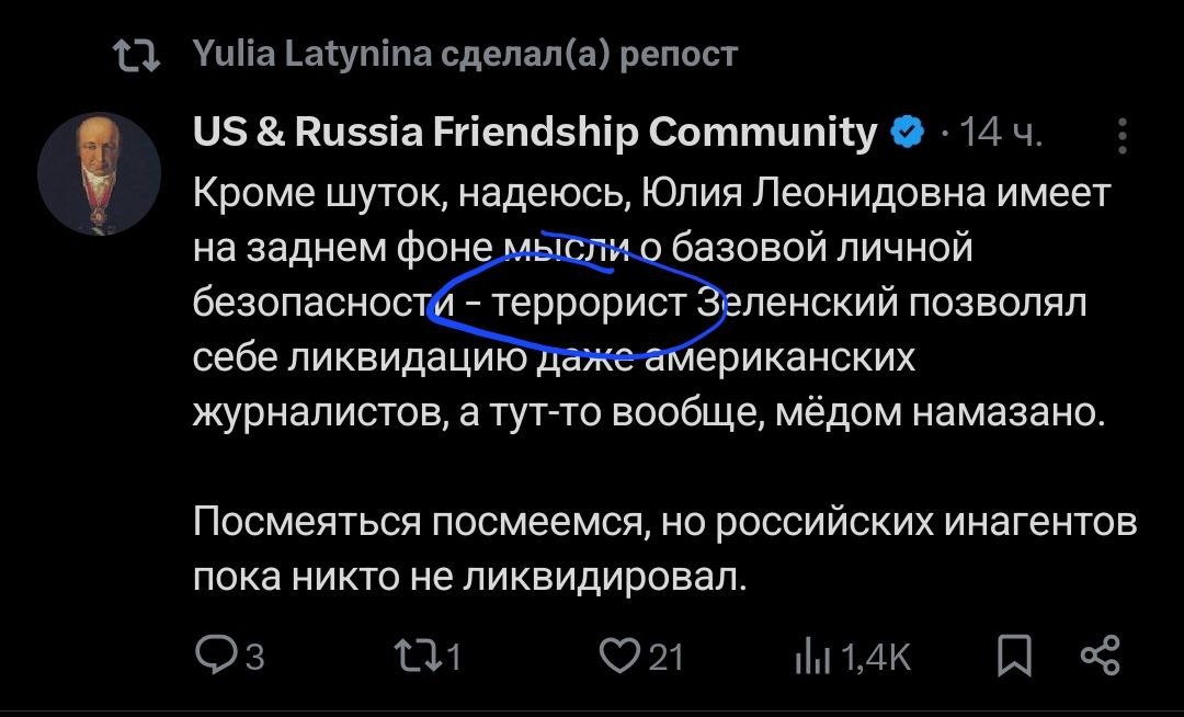 Ну, что Латынина решила выйти из рамок вроде бы приличного человека - с этим как раз не поспоришь. А вот почему у нее вдруг Зеленский стал Карабасом-Барабасом - это как раз вполне объяснимо: совершенно очевидно, что Латынина повторяет все нарративы за Арестовичем. Что несет Арестович - то потом несет и Латынина, я в этом много раз убеждался. Так что самостоятельности в этом у Латыниной - ноль. Она просто повторяет это все за Арестовичем как попугай.