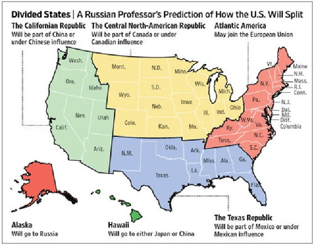 Потом переключился на отсчет недель до распада США на несколько частей. И какая часть куда или кому отойдет.