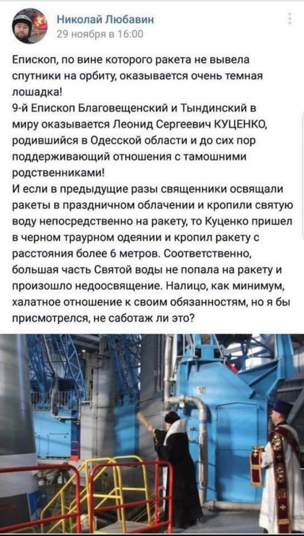 И в чём проблема? Архиепископ (до 1.02.2018 был епископом) Благовещенский и Тындинский Лукиан, в миру Леонид Сергеевич Куценко, уроженец Одесской области. Запуск действительно был неудачным. Это во-1. Во-2, Алекс ведь не про иерарха и освящение, а про Николая Любавина, обвинившего в неудаче епископа. Другое дело, что проснулся Экслер поздновато, об этом ещё год назад писали 😉