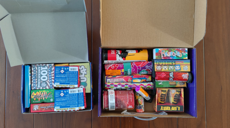 В прошлом году купили тот набор, который слева, в этом году дополнительно еще взяли отдельный набор с фейерверками покруче.