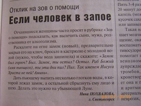 Есть же люди, во все что угодно поверят, Иисуса Христа приплетут к убывающей луне, а к рабу божьему наркологу не идут... Странные какие-то.