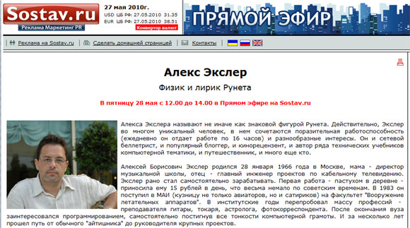 На сайте Sostav.ru завтра, 28 мая (пятница), с 12 до 14 по московскому времени буду в прямом онлайновом эфире отвечать на вопросы. Вопросы можно задавать уже сейчас - я на них потихоньку отвечаю, опубликовано все будет во время онлайнового сеанса.