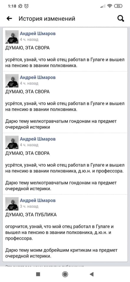 Исполняющий обязанности главного редактора издания "Ведомости", которое теперь нынче неофициально именуется "Шмаровозкой", вчера ночью не без воздействия седативных жидкостей писал и редактировал эпохальное "Послание К Этой Своре". Заинтересованные люди сохранили последовательность редакторских итераций этого знакового поста, и мы можем наблюдать за процессом редакторского творчества. Тем более что утром, когда волшебное действие седативных жидкостей перешло в оживляющую сознание головную боль, исполняющий обязанности главного редактора свое Послание почему-то стер. И теперь что мелкотравчатые гандоны, что добрейшие критики никак не усрутся узнав о том, что шмаровский героический папашка работал вертухаем в Гулаге и даже добился продвижения по этой почетной службе.
