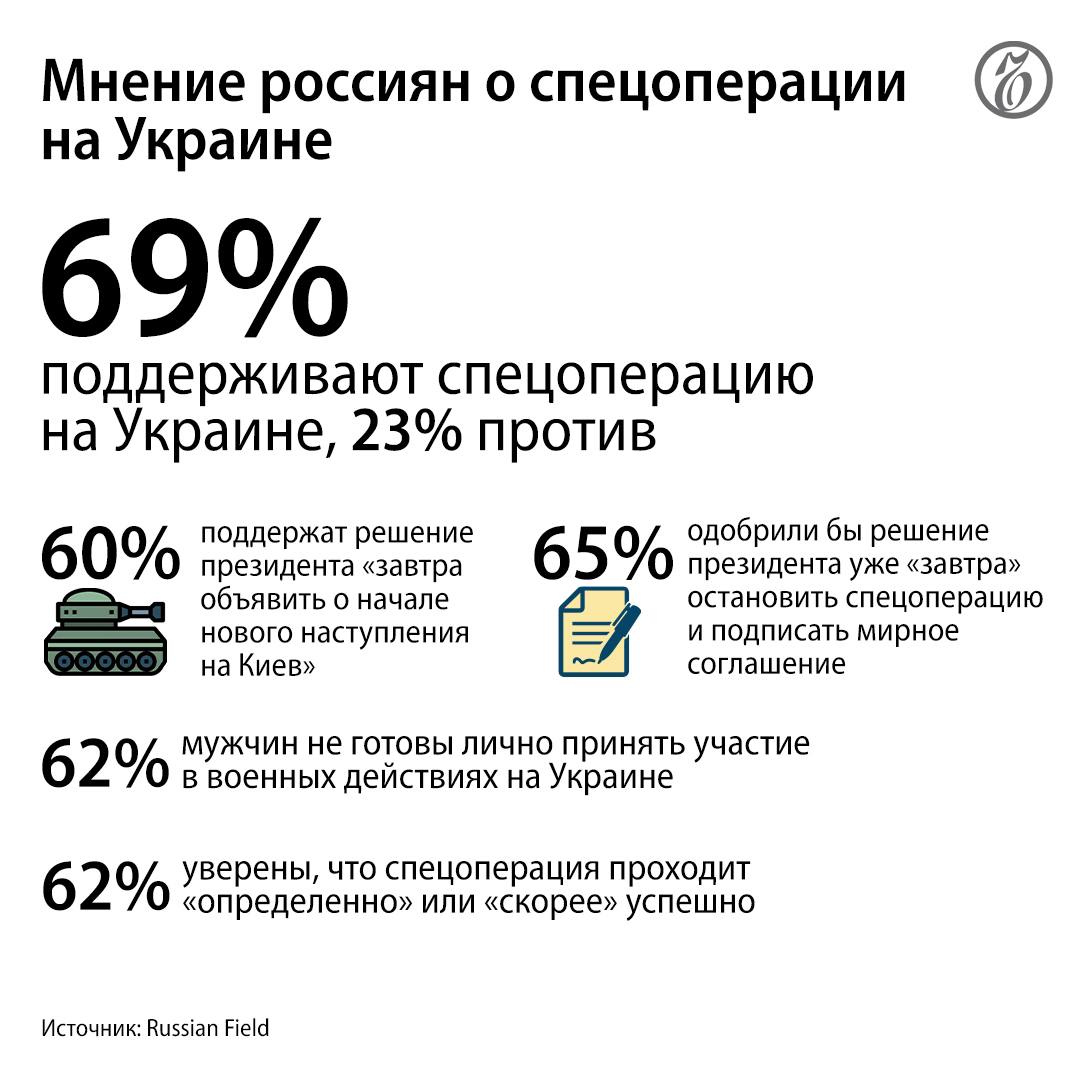 Более половины россиян считают, что специальная военная операция на Украине затянулась, а по мнению трети, военные действия продлятся еще более года, следует из свежего опроса социологической службы Russian Field. При этом 60% респондентов поддержали бы решение Владимира Путина начать «новое наступление на Киев», но одновременно 65% одобрили бы и намерение президента остановить спецоперацию и подписать мирное соглашение. Эксперт считает, что подобное противоречие связано с нежеланием общества думать о больших политических проблемах.