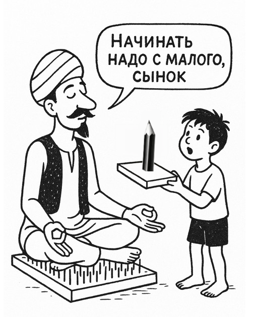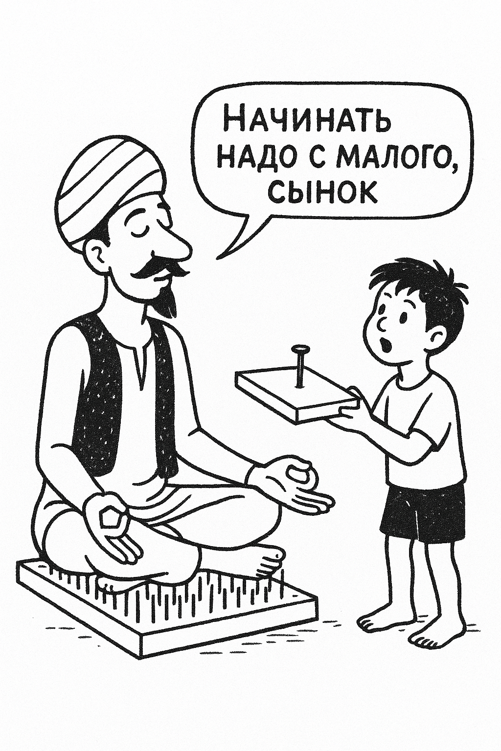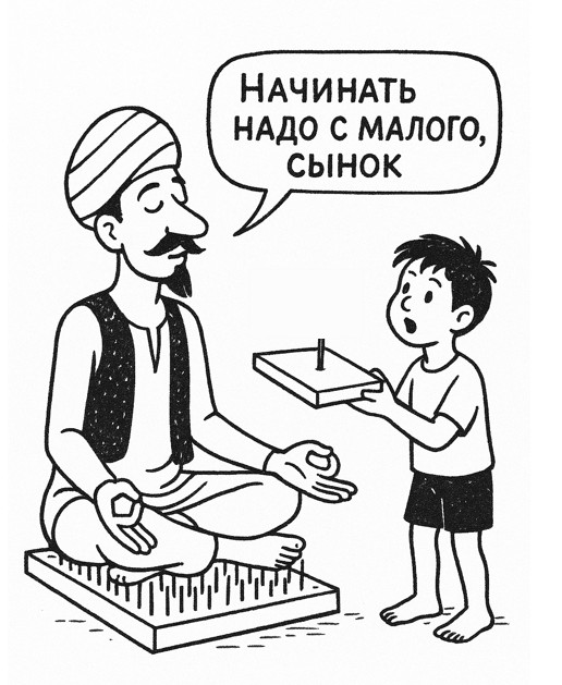 - Даю промпт. Чёрно-белая линейная карикатура в стиле советского журнала. Слева — отец-йог в чалме и только в набедренной повязке (без рубашки и штанов), сидит в позе лотоса на доске, полностью покрытой гвоздями. Все гвозди на доске направлены остриями вверх. Справа — мальчик держит маленькую доску с одним гвоздём, гвоздь остриём вверх. Речь произносит отец — текст в бабле: “НАЧИНАТЬ НАДО С МАЛОГО, СЫНОК”. Хвостик бабла указывает чётко на рот отца. Простая грубая штриховка, чёткие контуры, формат А4, высокое разрешение.