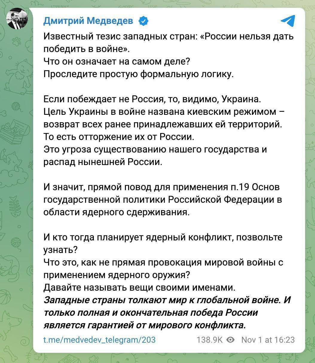Так кто тогда планирует ядерный конфликт, позвольте узнать? Очевидно, тот, кто принял такую ядерную доктрину и, имея такую доктрину, ещё и объявил своей чужую территорию. Руководители рашистской России, как сформулируют в будущем Мариупольском международном трибунале.