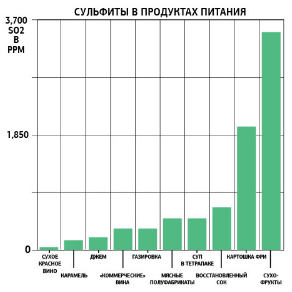 Напомним, что надпись «содержит серу» была введена на винные этикетки в США в 1986 году по законодательной инициативе сенатора Строма Турмонда, трезвенника по призванию, который хотел отвадить молодёжь от потребления алкоголя и придумал эту пугалку. И её подхватил винный мир, особенно Европа, т.к. на тот момент Америка была (и остаётся до сих пор) её самым крупным и желанным рынком. А нам надо не забывать о двух вещах. Первое: аллергией на серу страдает не более 0,2% мирового населения, существенная часть которого вообще не пьёт вина. И второе: вино является продуктом с самым низким содержанием серы из всего того, что человек регулярно принимает внутрь. Даже «коммерческие вина» содержат меньше серы, чем газировка, упакованное мясо, готовые супы, замороженные соки, картофель-фри и особенно всякий изюм, курага и прочий урюк, где сульфитов в сотни раз больше (см. диаграмму). Вы слышали, чтобы кто-то отравился или умер в серных конвульсиях от изюма? Страшилки про серу во всей этой натюр-истории являются самым галимым маркетингом. Это очередная «точка G» в человеческой психике, на которой зарабатывают неплохие деньги, прикрываясь заботой о потребителе.