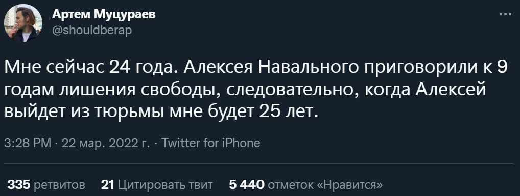 Если Артем Мацураев умрет в 2023, то вне зависимости от года освобождения Навального ему будет тогда 25 лет.