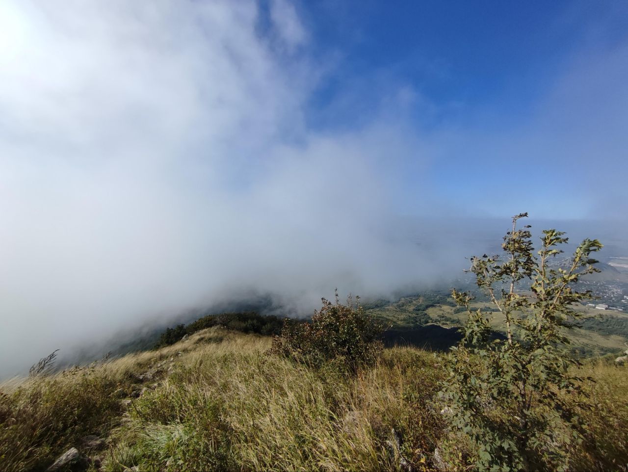 📍 Вероятнее всего — Бештау, вид с одной из вершин вниз на Пятигорск, Лермонтов и туман над Кавминводами.