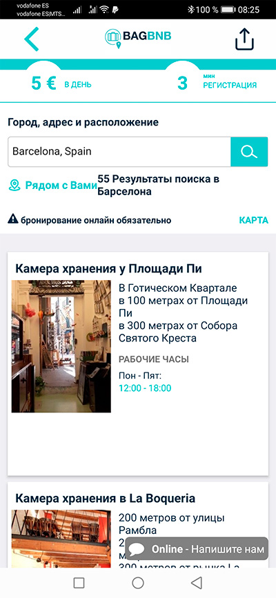 Так вот, оказывается, есть решение проще. У френда в Facebook вчера промелькнула ссылка на бесплатную программу Bagbnb (для айфонов тоже есть). Простая, как две копейки. Устанавливаете и ищете камеры хранения поблизости. И они находятся - оказывается, камеры хранения есть далеко не только на вокзалах. Все удовольствие - €5 в день. Насколько я понимаю, это за одно место багажа: чемодан или сумка. Платить нужно вперед - видимо, это делается для того, чтобы гарантировать наличие места, иначе возможен вариант, когда вы придете к камере хранения, а там нет мест.