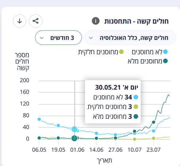 Это - количество заразившихся, тёмно-зелёные - привитые, голубые - нет, светло-зелёные - частично ппривитые: datadashboard.health.gov.il
