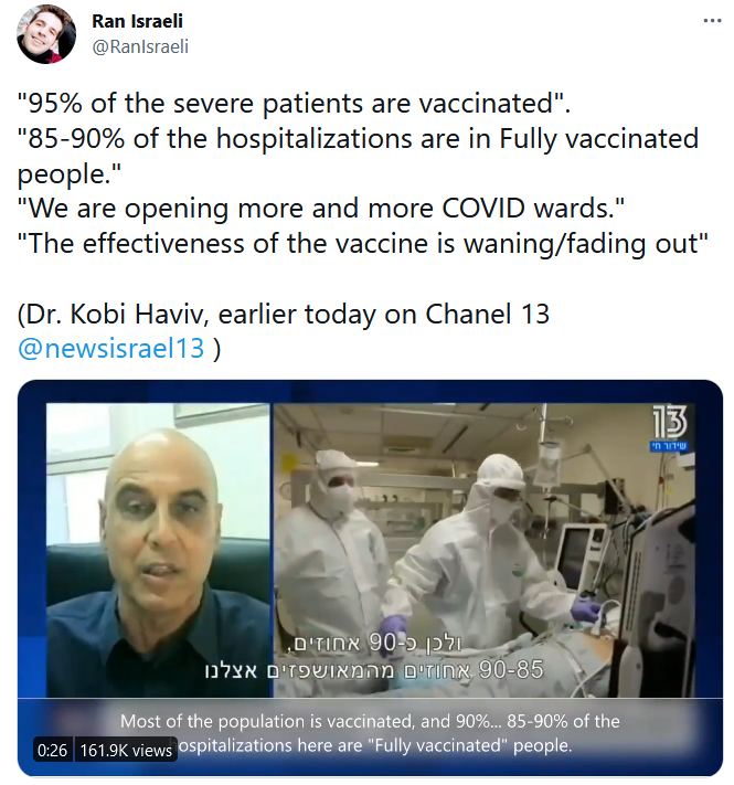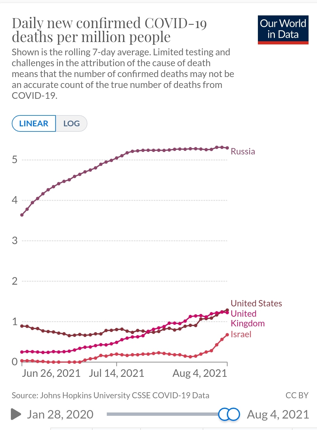 Израильский эксперимент показывает, что поголовная вакцинация мало что даёт. Важно вакцинироваться нам, пожилым людям и хроническим больным. А если кто думает, что именно отказ отдельных нехороших людей не даёт открыть границы и снять другие обременительные ограничения, то гляньте на успехи Израиля после вакцинации: ограничения на выезд усилены, введена уголовная ответственность за посещение многих стран; правительство обсуждает, когда вводить следующий локдаун -в сентябре, или сразу в августе.