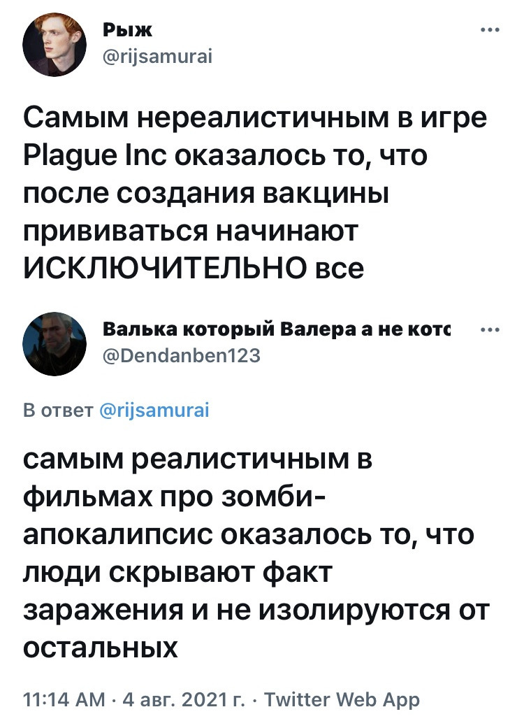 ЗЫ. Я вчера тут писал что дядя мой умер от ковида. и мы его похоронили. пришло мало людей, что необычно для нашей территории, но как оказалось из всех пришедших я оказался чуть ли ни единственным вакцинированным. Более того, когда пошел разговор про вакцину, один из пришедших сказал что его знакомый врач посоветовал ему не делать этого, не рекомендует. Это же синтетическая вакцина, и фиг его знает что нам колят. И конечно, рассказчик нашел дружную поддержку среди собравшихся.