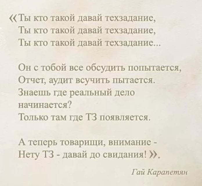 у меня в строительстве такая поговорка ходит: нет ТЗ - получишь ХЗ