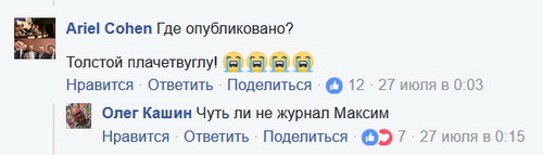 Нормально так, да? Признаться в том, что он перепечатал какую-то херь из говноиздания - Кашину религия не позволяет. Поэтому надо в качестве источника указать вполне уважаемое издание. Причем так искусно, чтобы его при этом не засудили за клевету. Чуть ли не журнал "Максим". Ложечки-то найдут (там у него в комментах дали ссылку на источник - "Кто есть кто"), а осадочек останется.