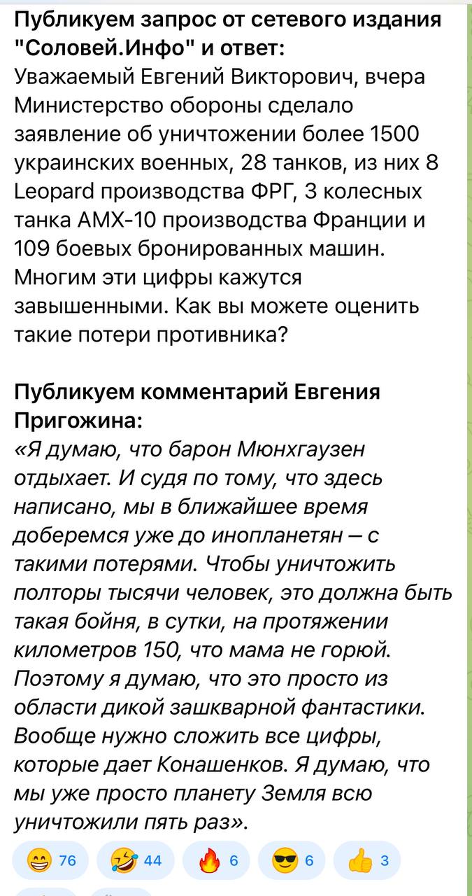 Ну и, понятное дело, ответочка ему совершенно точно прилетит. Потому что как можно говорить, что цели спецоперации не достигнуты, когда эти цели уже менялись раз двадцать?!! Это же спецоперация, и цели там - гибкие, меняющиеся. Песков же сказал что все цели будут достигнуты! Помните историю о девушке, которая стреляла из лука в лесу по мишеням, и всегда попадала в самый центр. Потом, правда, выяснилось, что она сначала стреляла, а потом бумажную мишень надевала на стрелу.