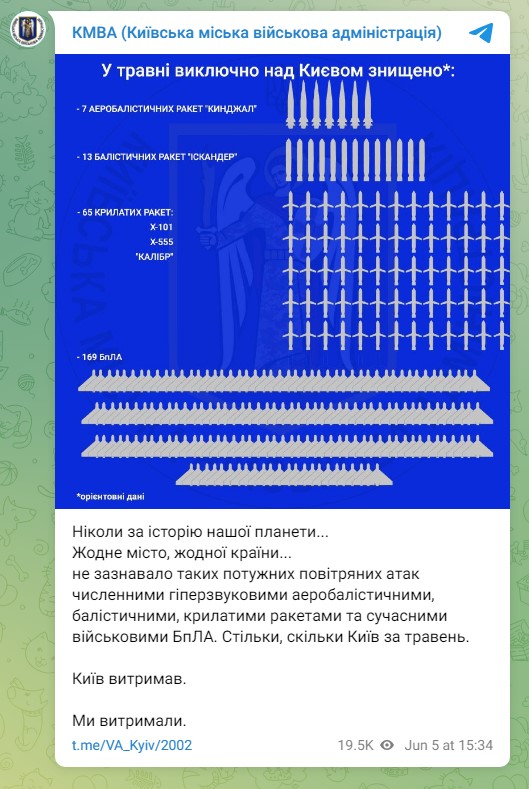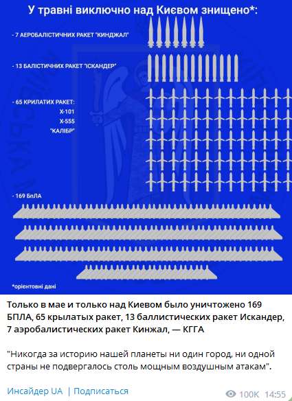 не подвергалось столь мощным воздушным атакам многочисленными гиперзвуковыми аэробалистическими, баллистическими, крылатыми ракетами и современными военными БпЛА. Столько сколько Киев за май".