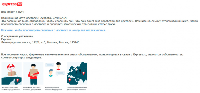 Да, ну и еще, конечно, получатель "undisclosed-recipients:" - это прям садись, два, однако кто в самом деле обращает внимание на поле "Кому"? Увидели, что посылка едет, нажали, чтобы посмотреть "сведения о доставке" - спамеру профит.