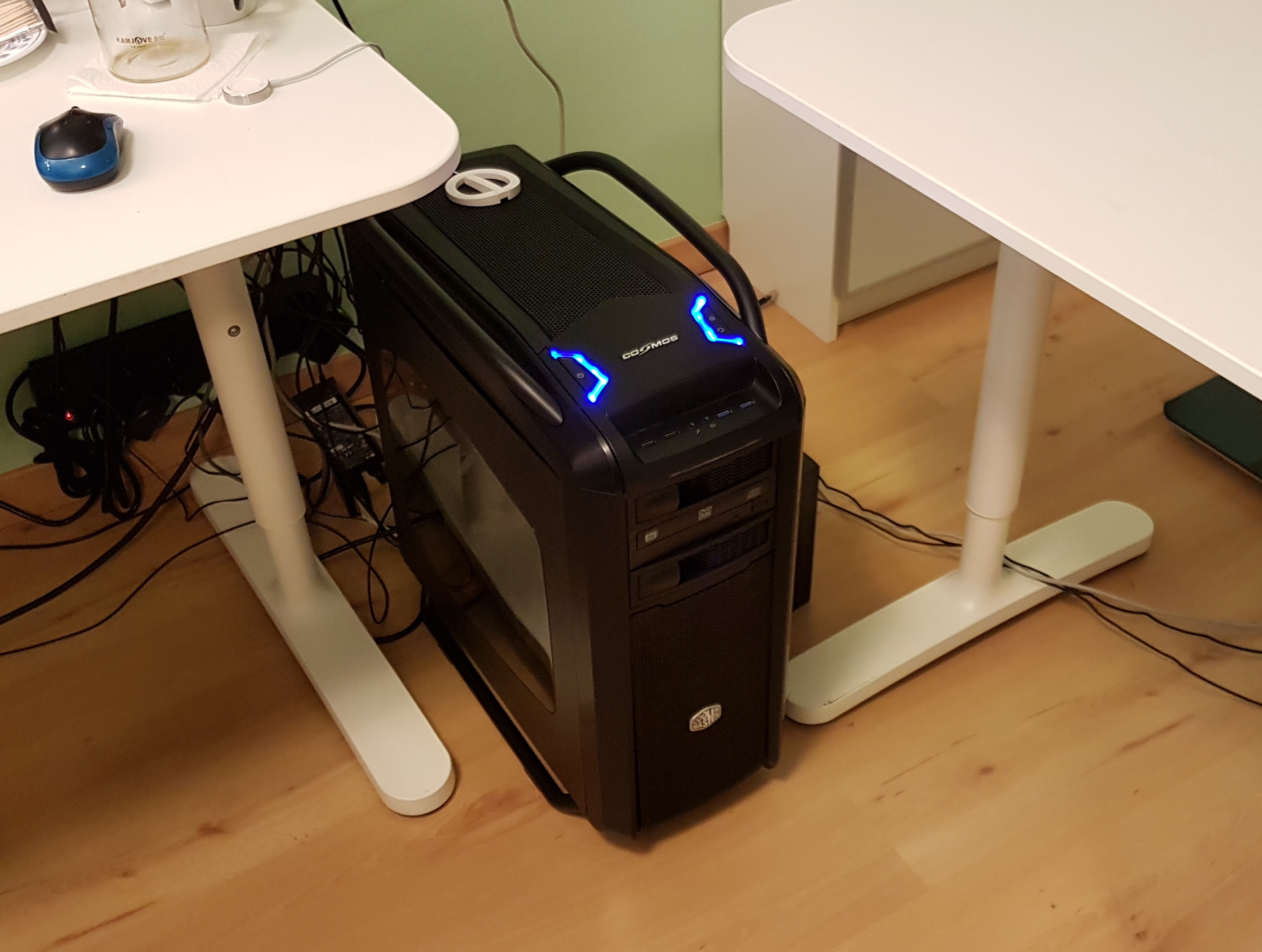 Перебортировал свой орденадор. Люблю я это дело - новый корпусок, новые кулеры и все такое. Правда, не нашел, к чему подключать светодиоды передней панели (там двухконтактные головки, которые на матери втыкать просто некуда), но мне как-то и не надо, чтобы она светилась: главное - было куда подключить все пять кулеров корпуса. И очень понравилось, что в этом корпусе жесткие диски ставятся в корзину поперек - намного удобнее подводить кабели.