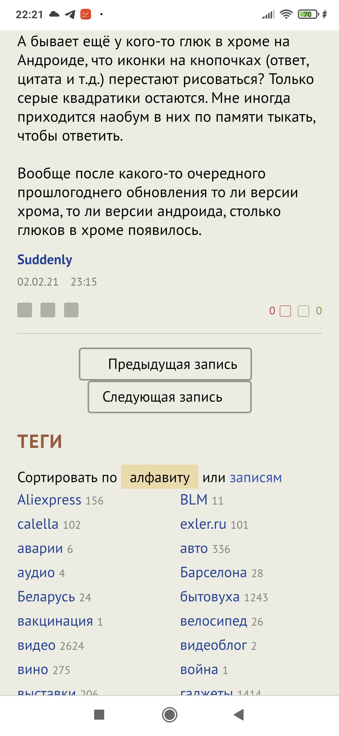 бывает ещё у кого-то глюк в хроме на Андроиде, что иконки на кнопочках (ответ, цитата и т.д.) перестают рисоваться? Только серые квадратики остаются. Мне иногда приходится наобум в них по памяти тыкать, чтобы ответить.