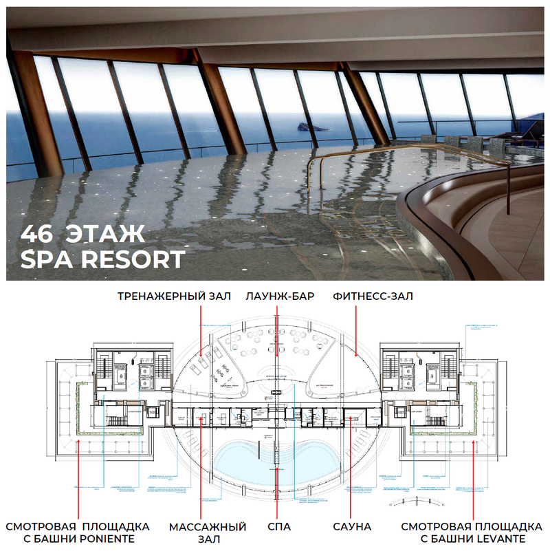Самые верхние этажи – 46 и 47, будут отданы под СПА с тренажерным залом, крытый бассейн с панорамным видом, скай-бар, лаунж и территорию солнечных ванн.
