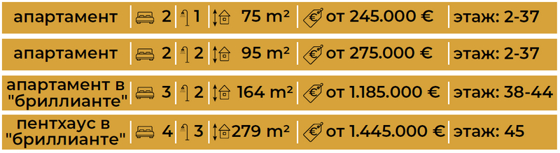 В каждой из двух башен - по три апартамента на этаж. И так со 2 этажа по 37 этаж. В них по 2 спальни, угловые квартиры по 95 м2, центральная – 75 м2. Летом 2019 уже есть оборудованные готовые пилотные апартаменты с мебелью и полной отделкой. Стартовые цены – от 245 000 евро до 497 000 евро, в зависимости от этажа.