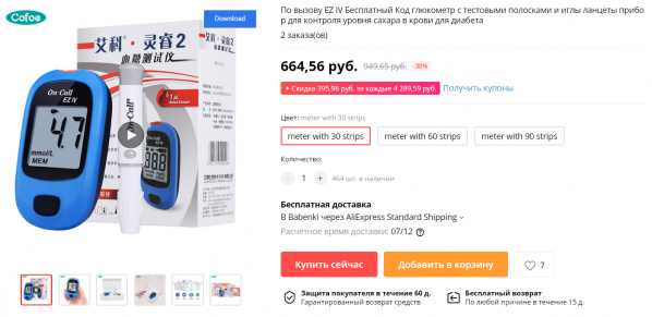 И когда вы эту коробку вскроете, вы обнаружите вот такой самый обычный китайский инвазивный глюкометр, стоимостью в 660 рублей на Aliexpress, причем еще и вовсе без тест-полосок. И в России эти тест-полоски не продаются, их нужно заказывать на Aliexpress. (Во многих случаях, как я читал, устройство и вовсе было бракованное, не работало вообще.)