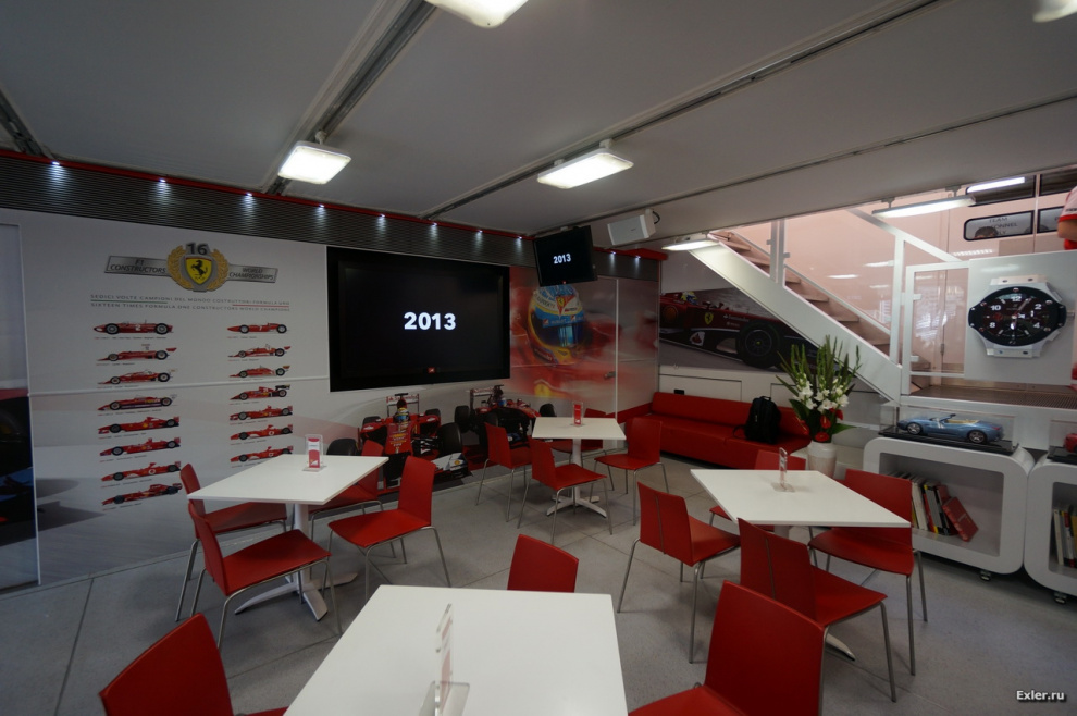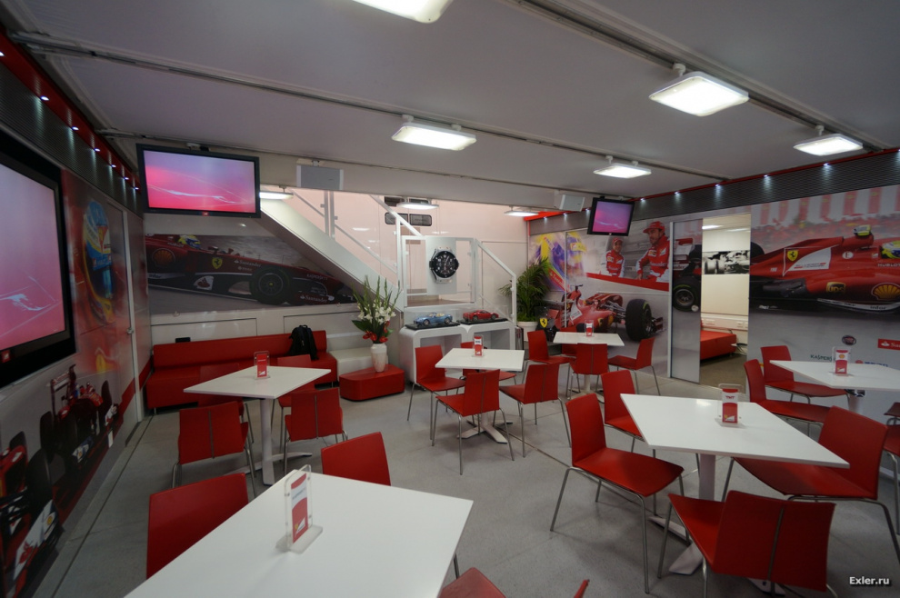 Первый этаж - пресс-зона, второй этаж - закрытая зона, где могут находиться только работники конюшни, на третьем - открытая площадка, где тусуются члены команды.