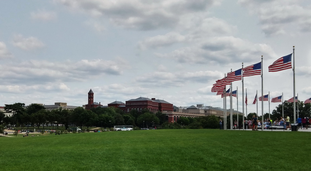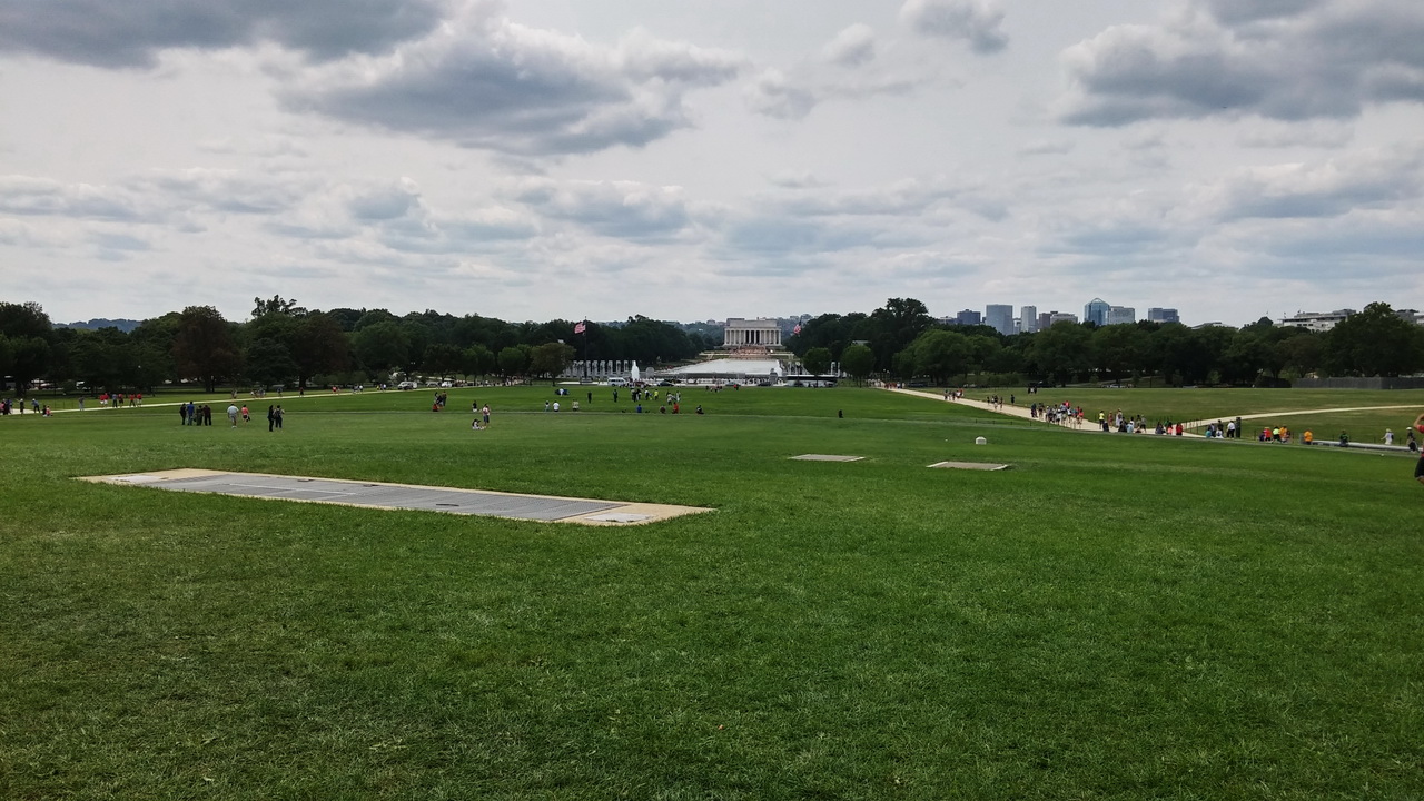Вид на монумент Вашингтона и сзади видно здание Капитолия. Тут, кстати, забавная оптическая иллюзия: кажется, что монумент довольно близко, а отсюда до него пешком - не менее получаса.