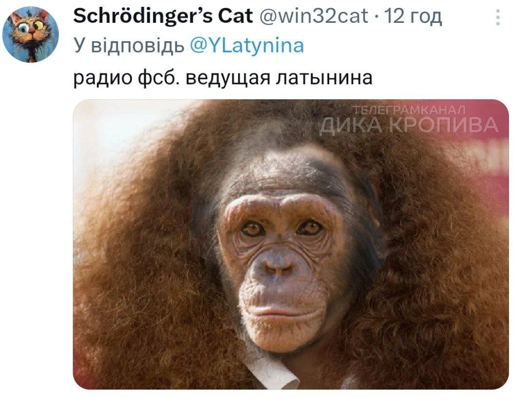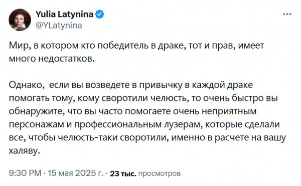 Я периодически заглядываю в Твиттер Латыниной, чтобы посмотреть, какое очередное дно пробьет эта "талантливая и глубокая журналистка" ((с) Венедиктов). Ну, по поводу глубины Венедиктов действительно был прав: глубоко плавает талантливая журналистка известно в чем, дно там вообще как-то не наблюдается.