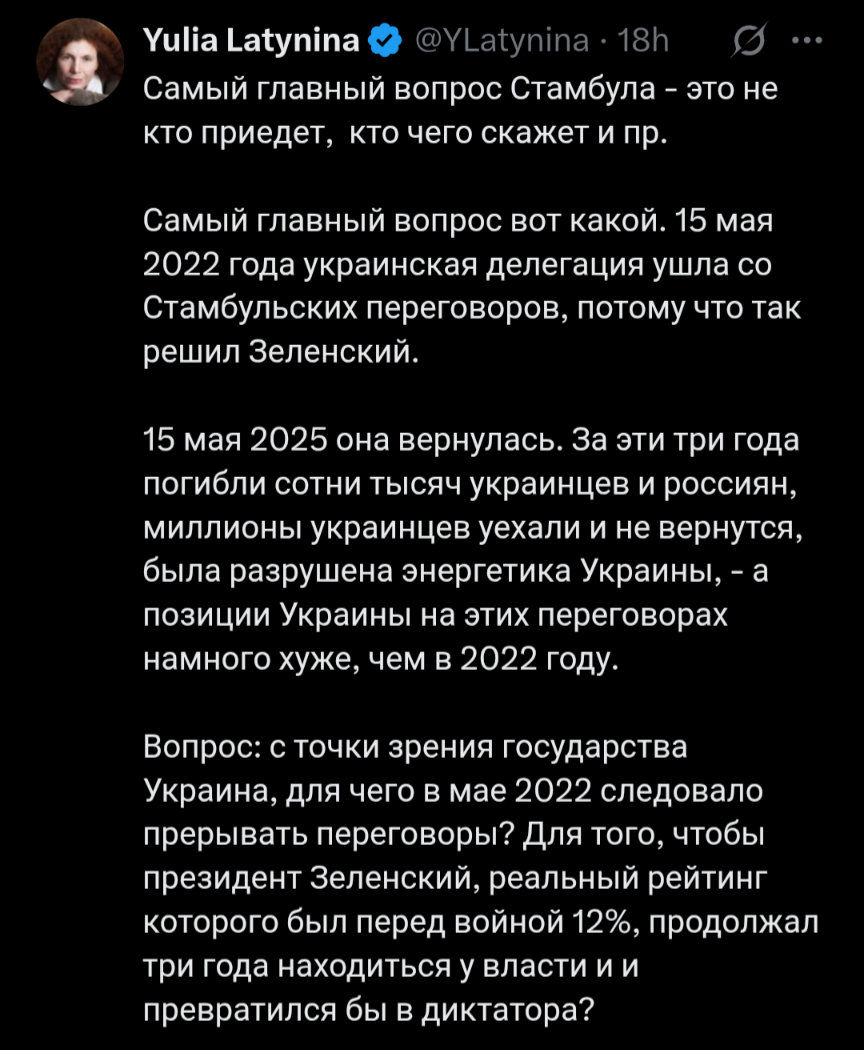 UPD Посмотрел её пред-предыдущий пост в Х... там она на голубом глазу удивляется, почему Украина сдалась, к чему все эти жертвы.
