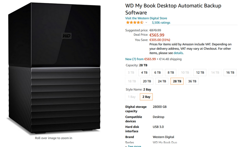 В немецком "Амазоне" можно купить WD My Book Desktop с двумя дисками по 14 ТБ всего за €565. Что интересно, с 4 ТБ эта машина стоит €269. В испанском "Амазоне" такой же на 28 ТБ стоит уже €769. А отдельный диск 14 ТБ - €471. То есть на немецком "Амазоне" получается более чем в два раза дешевле, учитывая стоимость самого устройства. Прям хочется купить, хотя у меня дома этих емкостей - где-то на 30-40 терабайт.