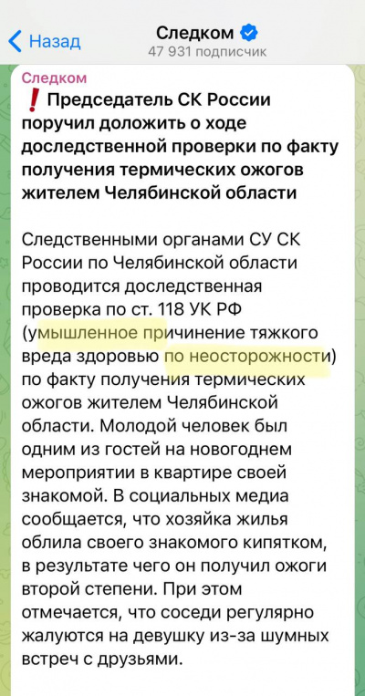 И у меня вопрос к Бастрыкину: в чем именно заключалась "неосторожность" этой девушки? В том, что она неосторожно умышленно вскипятила кастрюлю с водой и в том, что она неосторожно умышленно выплеснула кипяток на молодого человека? Экая она неосторожная, действительно...