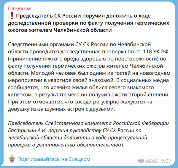 В Челябинской области группа молодежи отмечала Новый год в квартире некоей девушки. В какой-то момент девушке не понравилось поведение одного из молодых людей, она пошла на кухню, вскипятила в кастрюле воду, взяла эта кастрюлю и выплеснула кипяток на молодого человека. (Ролик уже вовсю гуляет по Сети, я его не буду здесь выкладывать.) Тот получил ожоги второй степени.