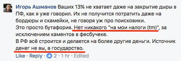 Как это часто бывает с "патриотами в доле", а Ашманов очень даже за долю госпирога глотку рвет, их подводит школьное образование, и по закону Даннинга Крюгера, они этого даже не понимают. Причем в конкретном случае оно подвело Ашманова как бы трижды. Начнем с того, что "мы-люди" платим далеко не только подоходный налог, который, к слову, составляет 10% от консолидированного бюджета. Мы же платим налог на прибыль частных компаний (еще 5%), на недвижимость (еще 5%), НДС (20%), акцизы и таможенные пошлины (15%) - это уже 55% бюджета. Далее - бордюры-шмордюры как раз делаются из местных бюджетов, а это на 100% прямо наши налоги. Наконец оставшиеся 45% бюджета состоят из мутных 10% (прочие доходы) и 35% НДПИ, налогов на прибыль госкомпаний и других сборов. Но даже и это по Конституции - наши налоги, так как недра в России принадлежат народу, и просто управляются государством (и в значительной кстати степени переданы в эксплуатацию частным компаниям). Так что и тут "заслуга" чиновников не превышает 10% бюджета при том, что на их аппарат в России уходит более 15% бюджета. Остальное - вклад населения, индивидуально или коллективно. И именно из этого вклада Ашманов рвется отьесть жирный кусок госзаказа, компенсируя спорность своих проектов верноподданическими но безграмотными экономическими заявлениями.