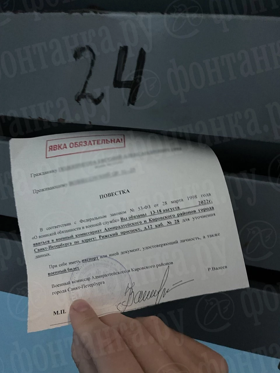 Жители центра Санкт-Петербурга начали массово получать повестки в военкомат, сообщает «Фонтанка». В повестке стоит штамп «Явка обязательна».