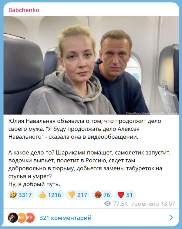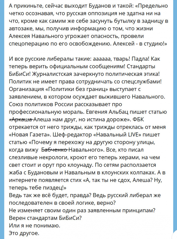 Услышал в "Грэме" про пост Бабченко по поводу смерти Навального - зашел убедиться. (Я этого персонажа, ясный пень, не читаю.)