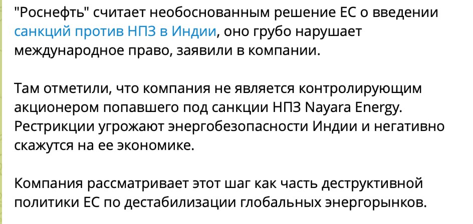 Ну, посмотрим. Индия закупает дофига российской нефти - порядка 36-40%. Если она действительно от этого откажется, то по РФ это ударит довольно сильно.