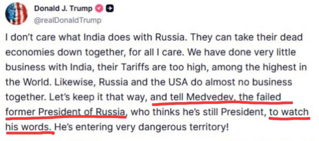 Трамп у себя в Трус-социал объявил о том, что вводит 25-процентный налог на Индию плюс штрафы за закупку оружия и энергоресурсов у РФ.