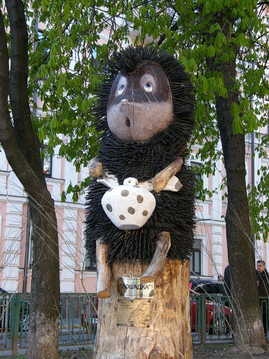 Ёжик смотрит на памятник «Защитникам границ …» (Это такой конный монумент) с открытым ртом, сидя на пне и держа свой знаменитый узелок в горохи, а подпись этого сооружения такова: «Лошадка». На самом деле сейчас уже немногие помнят, что мультик назывался именно «Лошадка».