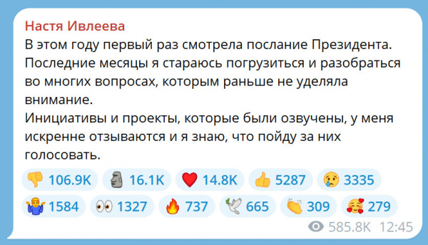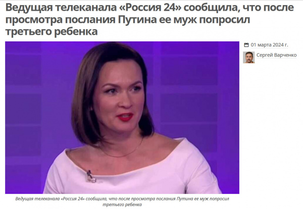 Ведущая телеканала "Россия 24" сообщила, что после просмотра послания Путина её муж попросил третьего ребёнка.
