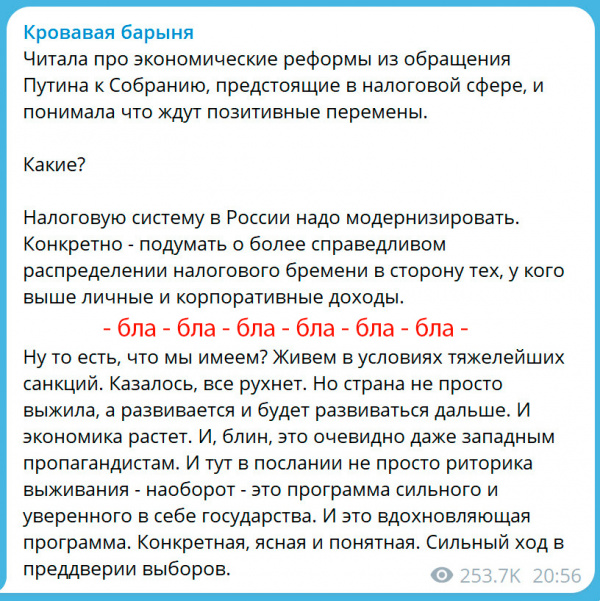 Шел двадцать пятый год правления Путина. Бункерный дедушка в очередной раз отбормотал всякую ерунду Федеральному собранию, поставив мировой рекорд по длительности посылания Федерального собрания. Жополизы и пропагандоны зашлись в воплях: "Историческая речь", "Теперь заживем", "Наконец-то у нас будет сильное и независимое государство", "Ничего подобного раньше не было", "Выглядит молодцом, рукопожатие ручки кресла - крепкое" и так далее.