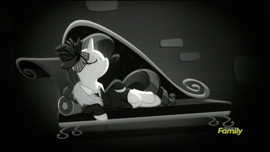 Там в сериале была серия, сделанная в жанре нуарного детектива. И эта поня выступала как в роли частного сыщика, так в роли "роковой шикарной женщины-вамп". Данный кадр, где она возлежала в черном платье и вуали, допрашивая подозреваемых, похитил сердца многих зрителей, даже далёких от этой нуарной стилистики )