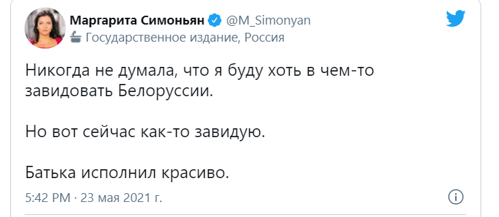 "Российские власти не согласились с оценкой Запада в отношении произошедшего с рейсом Ryanair. Министр иностранных дел России Сергей Лавров призвал оценивать ситуацию "не сгоряча, не впопыхах", а официальный представитель российского МИДа Мария Захарова заявила, что реакция стран ЕС и НАТО на инцидент "вызывает удивление". Представитель Кремля Дмитрий Песков отказался давать какие-либо комментарии на эту тему."