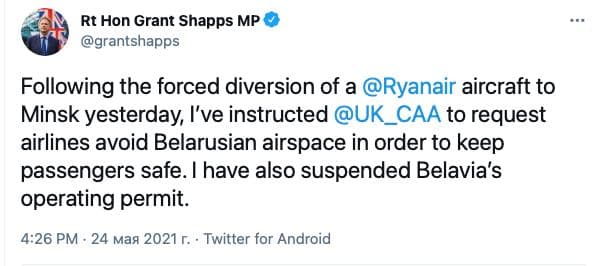 24 мая правительство Литвы решило с 25 мая запретить прибытие в страну и вылет из Литвы самолетов, маршрут которых проходит над территорией Белоруссии.