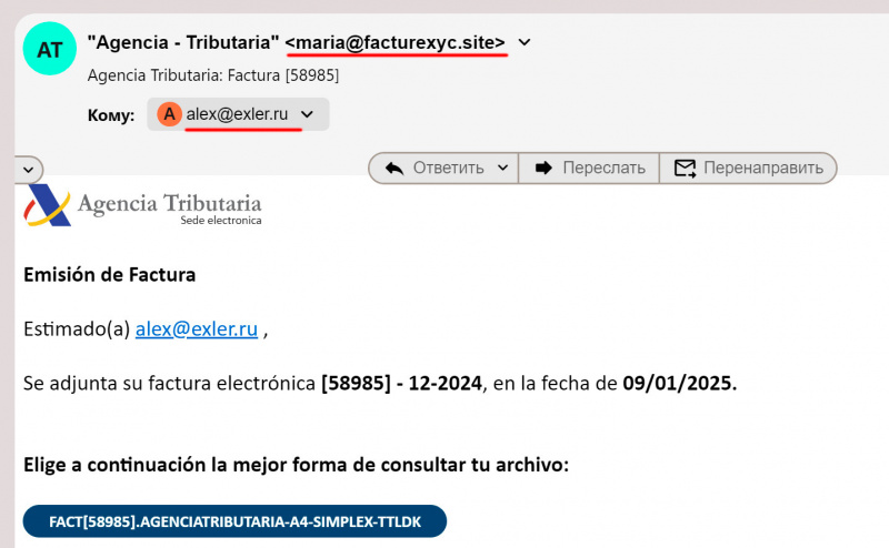 В рф я уже раз пять получал фейковые письма от налоговой и госуслуг. Очень примитивно, но ведь в определённом количестве случаев - работает. Именно по этой причине всеми налогами своих пожилых родственников занимаюсь сам, не давая им и шанса совершить глупость.
